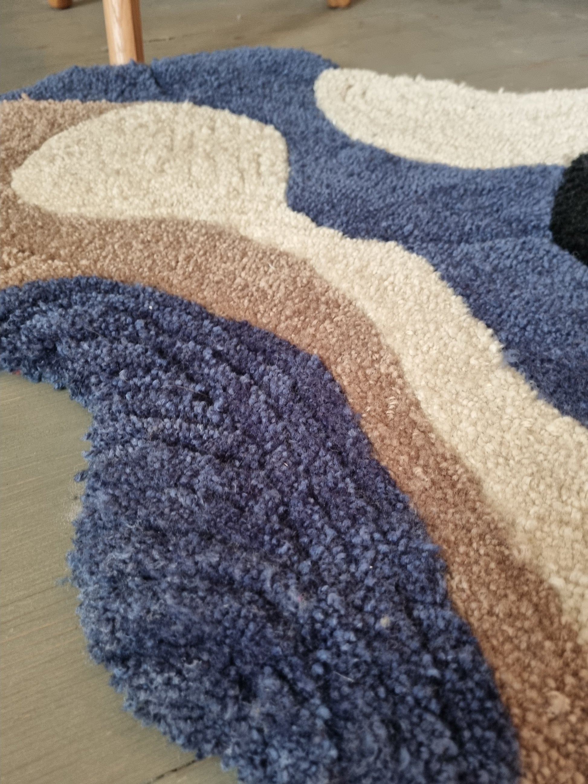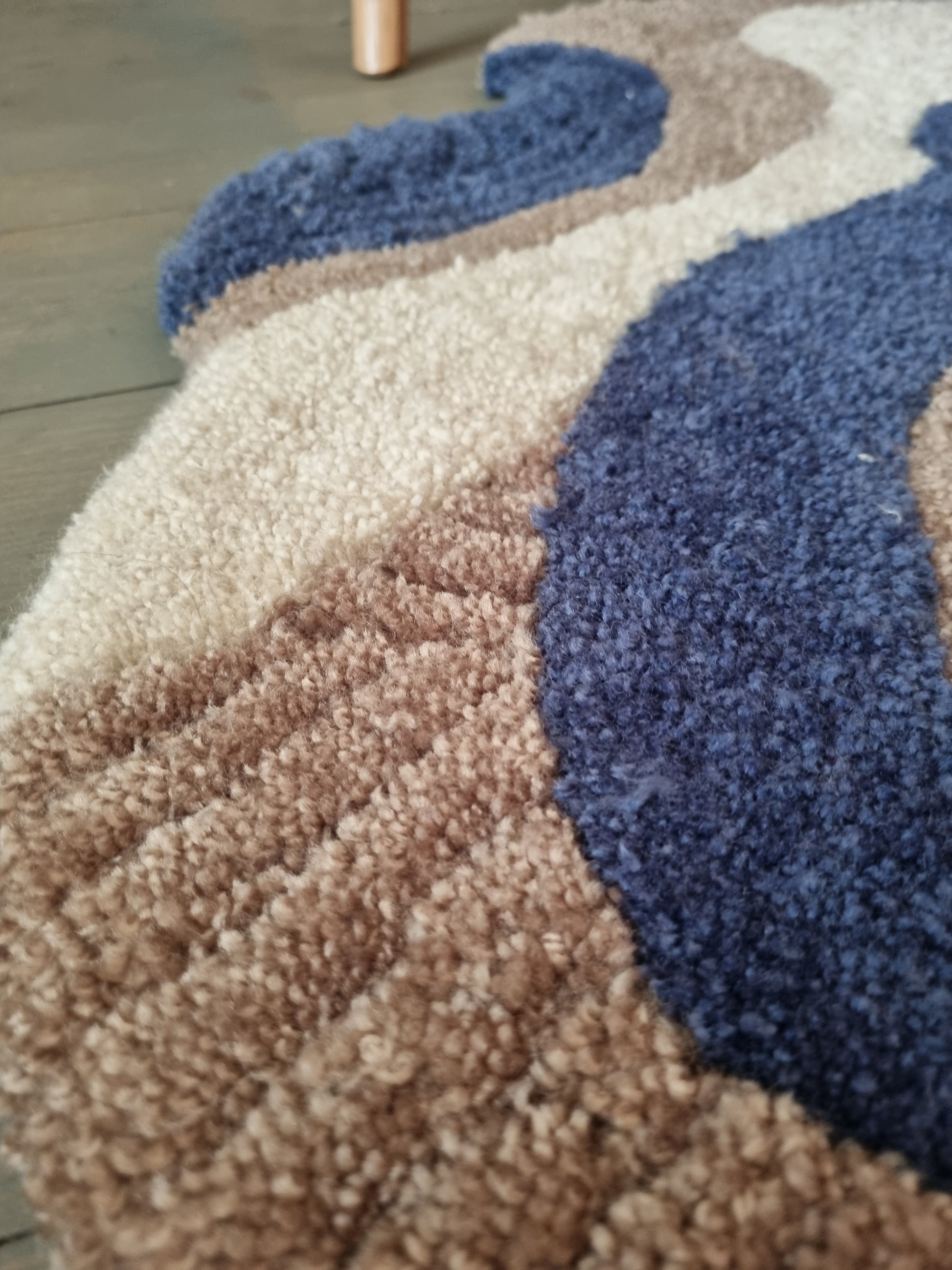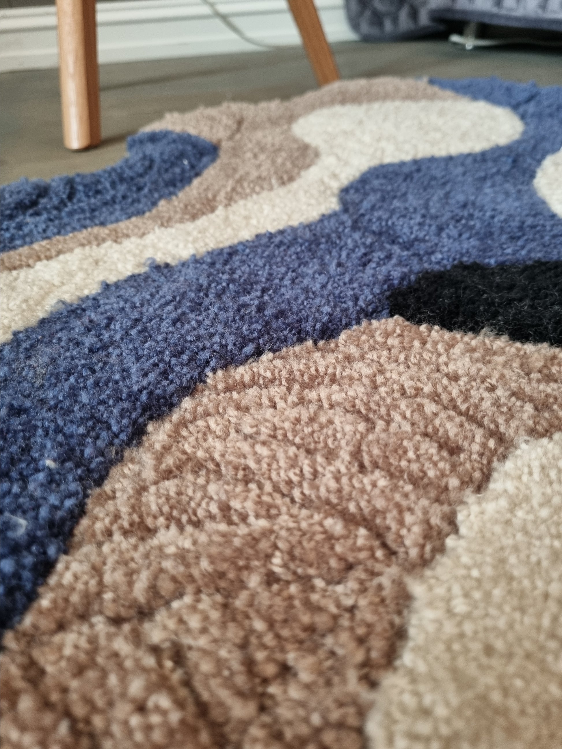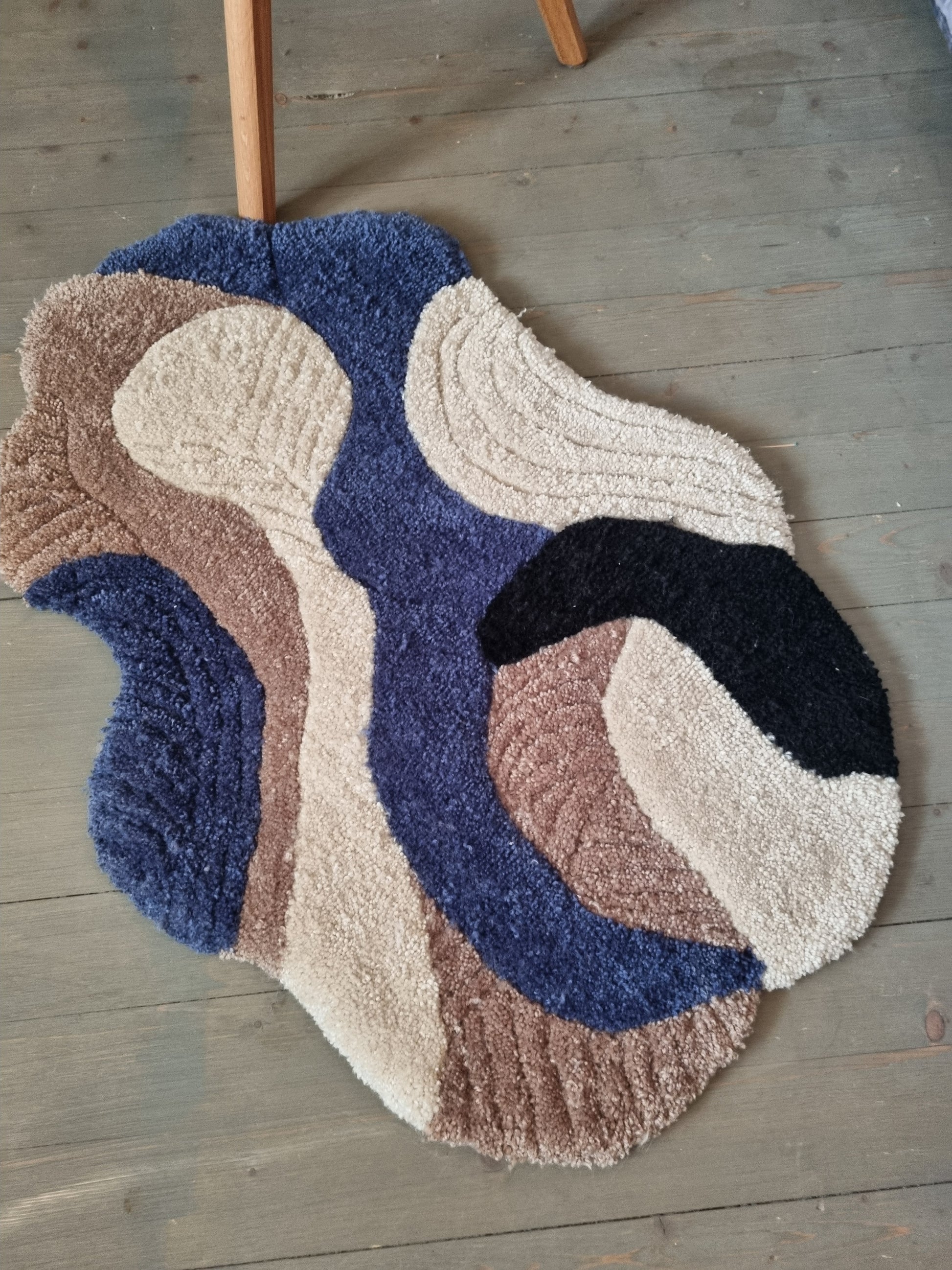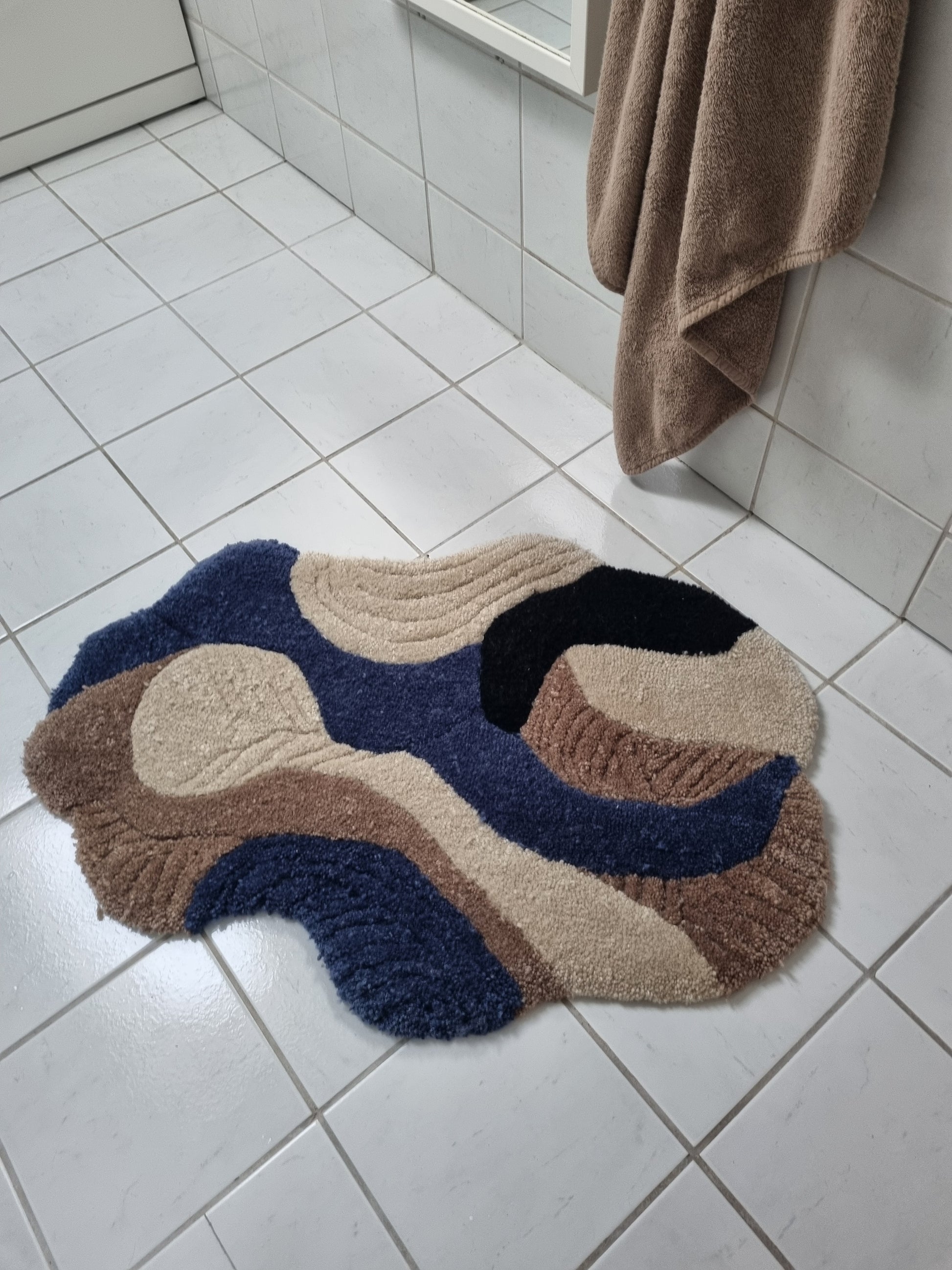 Dette unike, håndtuftede teppet kombinerer funksjonalitet og estetikk i en harmonisk miks av blåtoner, beige, lys brun og sort. Den myke, asymmetriske formen og taktile teksturen gjør det til et blikkfang i både baderom, soverom eller kontor.